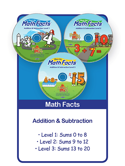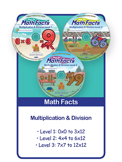 Meet the Math Facts DVDs make learning math facts fun and easy! You will learn basic equations through fact families. First you will learn addition & subtraction equations to 10+10, and next you will learn multiplication & division to 12-12. Our four video workbooks provide hours of drills so that you will learn to recall math facts with rapid SPEED!