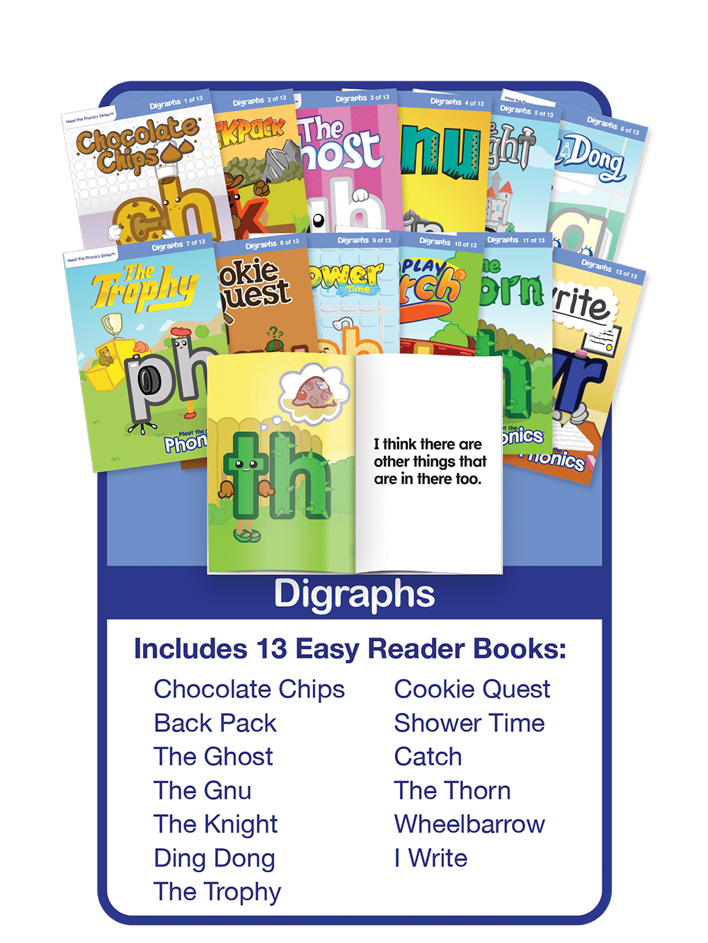 Two letters that come together and form a single sound are taught in primary schools as "letter digraphs." Meet the Digraphs DVDs make learning to identify digraphs fun and easy! Now children can practice what they have learned with Meet the Digraphs Easy Reader Books. With 13 books, children can practice different sounds that each digraph makes. Preschool Prep Series Products have won hundreds of awards and are used in millions of homes and schools around the world across the country. You will be amazed at what your little one can learn!™- Includes ch, ck, gh, gn, kn, ng, ph, qu, sh, tch (trigraph), th, wh & wr